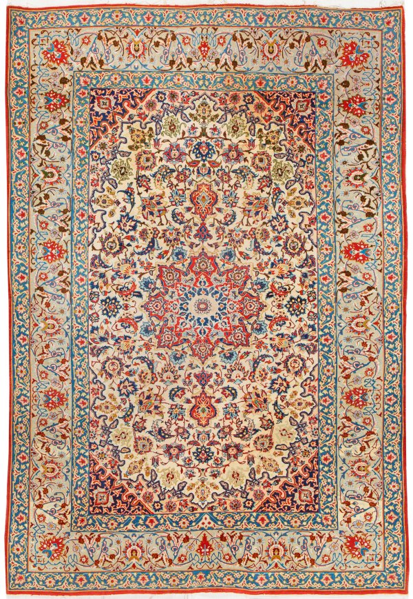 Persien. Mitte 20. Jh.; Korkwolle auf Seide. Sehr feine Knüpfung. Im elfenbeinfarbenen Innenfeld Zentralmedaillon mit Anhängern sowie passig geschweifte Ecklösungen. Flächendeckende Musterung aus Palmettenranken. Umlaufend breite, hellblaue Bordüre mit arabesk angeordneten Palmetten, flankiert von Blütenbändern. 148 cm x 216 cm.