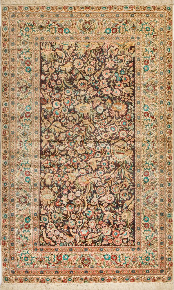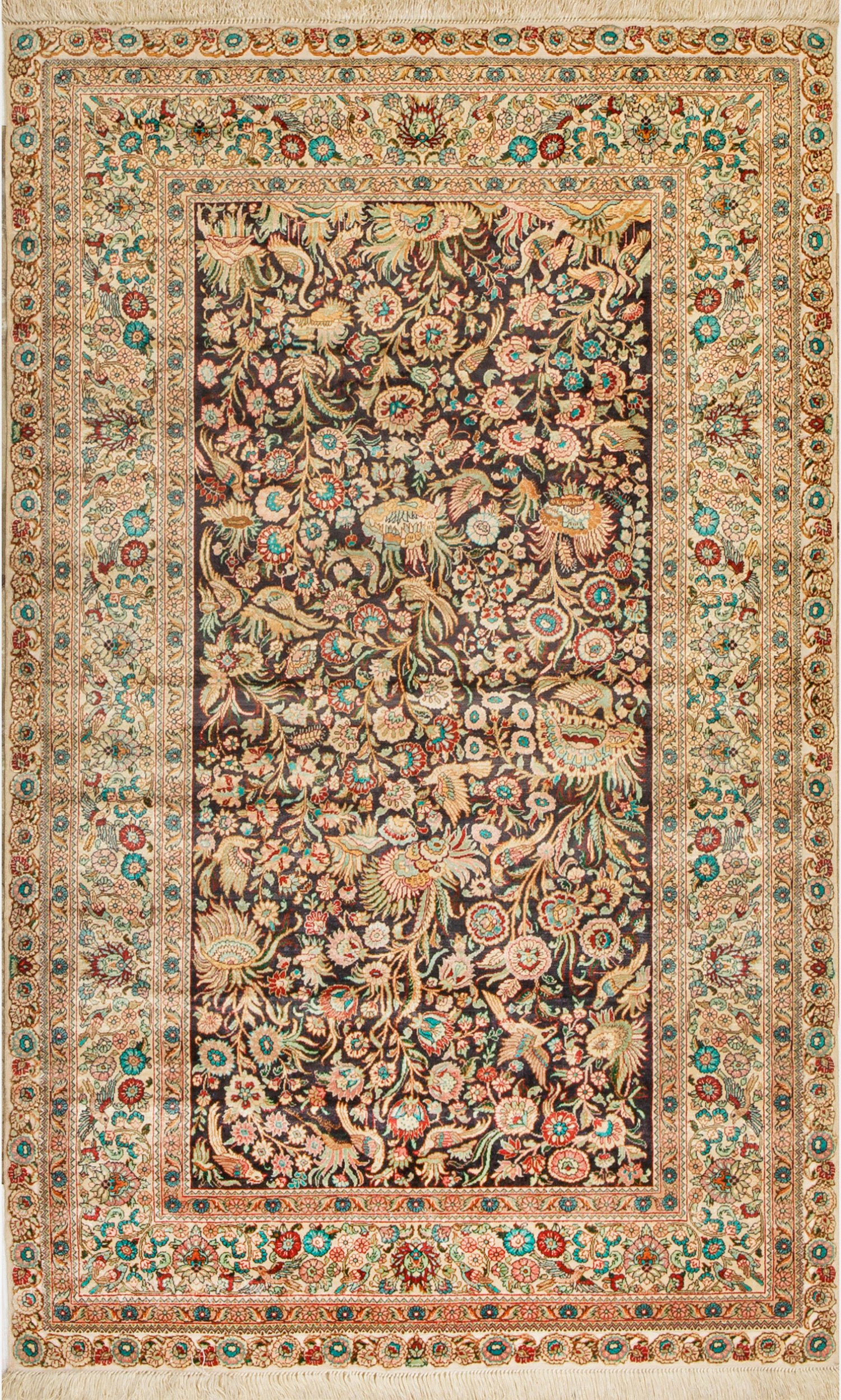Seide auf Seide. Sehr feine Knüpfung. Im dunklen Innenfeld flächendeckend Paradiesgartenmusterung aus dicht angeordneten Blüten und Vögeln. Umlaufend breite, elfenbeinfarbene Bordüre mit korrespondierendem Dekor, flankiert von schmalen Bändern. 153 cm x 93 cm.