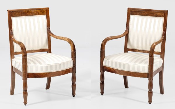 Mahagoni, massiv und furniert. Trapezförmige, schauseitig bombierte Zarge auf gegliederten Balusterbeinen, in geschwungene Armlehnen übergehend. Rechteckige Rückenlehnenrahmung. Gepolstert und bezogen. Sitz-H. 42 cm.