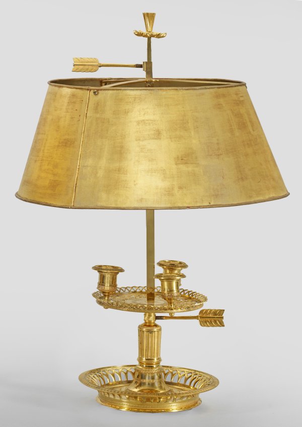 3-flg.; Messing, vergoldet sowie goldfarben lackiertes Blech. Über schalenförmigem, gitterartig durchbrochenem Rundfuß kannelierter Balusterschaft sowie ornamental durchbrochen gearbeiteter Nodus aus Palmetten als Träger für vasenförmige Tüllen. Davon ausgehend schlanker Schaft als Träger für konischen Lampenschirm. Innen drei Lampenfassungen, elektrifiziert. H. 61 cm.