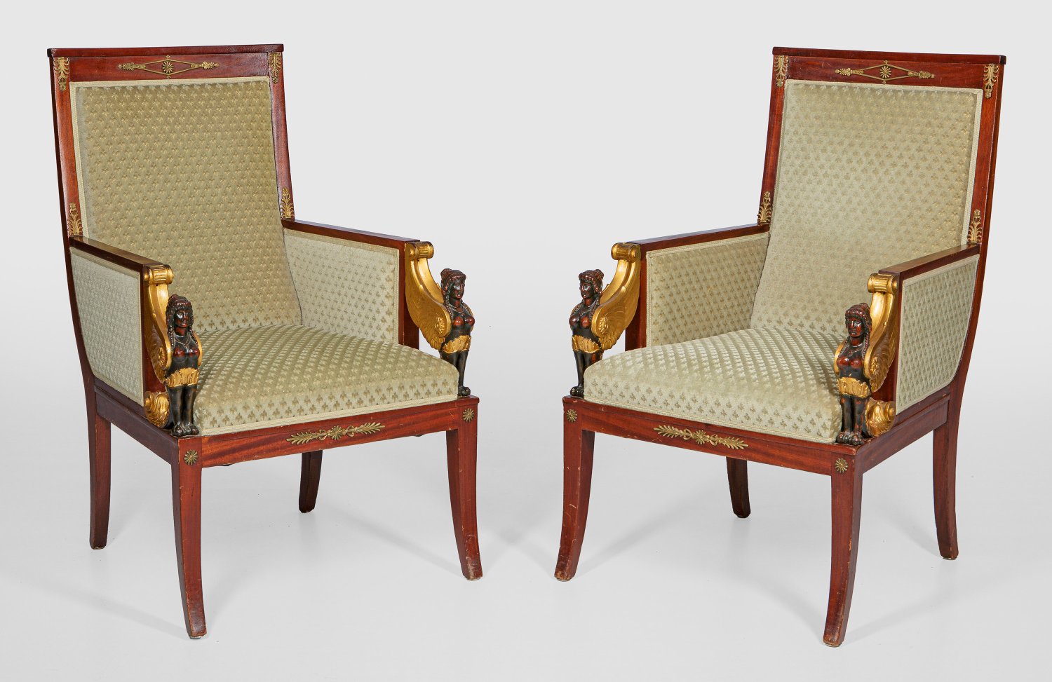Mahagoni, furniert sowie teilw. geschnitzt und ebonisiert bzw. vergoldet. Trapezförmige Zarge auf leicht ausgestellten Vierkantbeinen. Vollplastisch gestaltete Genien als Stützen für schmale Armlehnen. Hochrechteckige Rückenlehnenrahmung. Allseitig gepolstert und bezogen. H. 104 cm. 67 cm x 67 cm. Sitz-H. 46 cm.