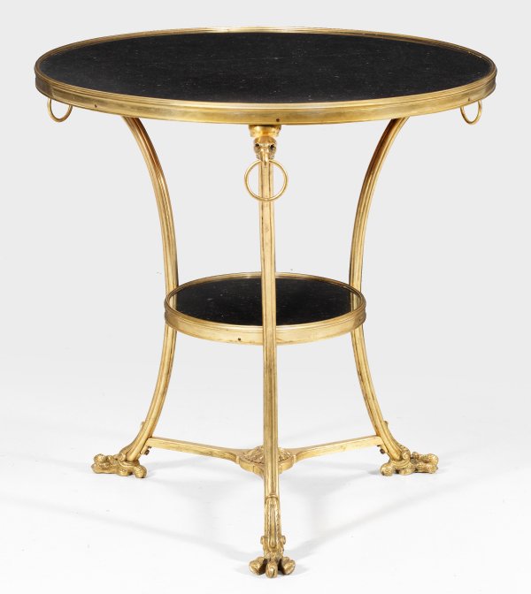 Bronze, vergoldet sowie schwarzer, hellgrau gemaserter Marmor. Schlanke, konkav eingezogene Profilstreben mit vollplastischen Adlerköpfen und Greifringen sowie vollplastischen Klauenfüßen, durch schmale Stege mit Blütenrosette verbunden als Träger für runde, profilgerahmte Deckplatte. Unterhalb korrespondierende Ablagefläche. H. 74 cm. D. 74 cm.