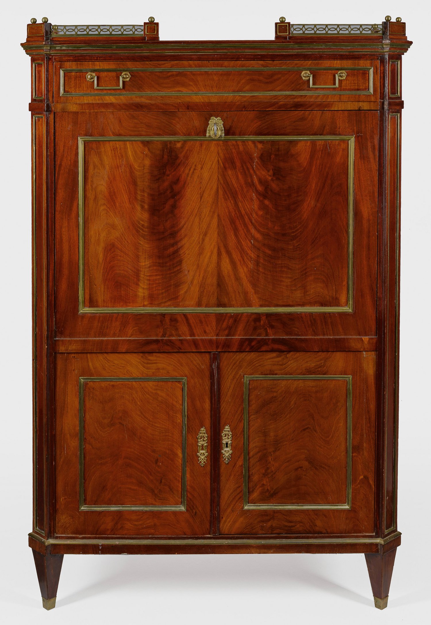 Mahagoni, furniert sowie Profile aus Messing. Gerader, hochrechteckig angelegter Korpus, flankiert von schräggestellten Ecklisenen auf konischen Vierkantbeinen. In der gegliederten Front zwei Türen sowie abklappbare Arbeitsfläche mit grüner, goldgeprägter Ledereinlage. Dahinter gestaffelte Büroeinteilung. Oberhalb breites Schubfach sowie gering überstehende Deckplatte mit durchbrochen gearbeiteter Galerierahmung, H. 154,5 cm. 104 cm x 47 cm.