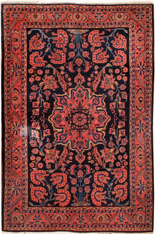 Persien. Mitte 20. Jh.; Wolle auf Baumwolle. Im tintenblauen Innenfeld großes, hellrotes Zentralmedaillon sowie flächendeckende Musterung aus großzügigen Blütenranken. Umlaufend breite, hellrote Bordüre aus Zackenblättern und Rosetten, flankiert von schmalen Bändern. Rep.; 141 cm x 214 cm.