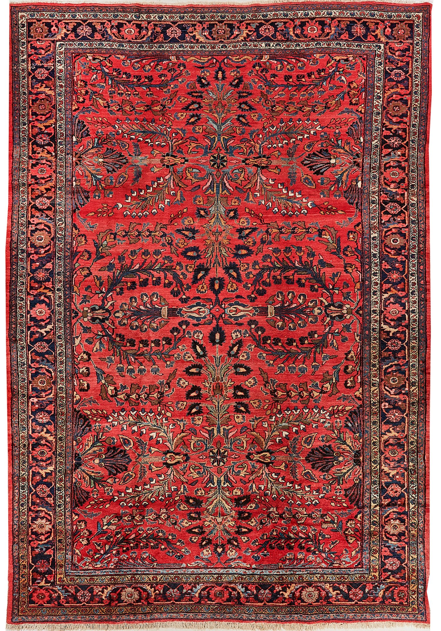 Persien. Mitte 20. Jh.; Wolle auf Baumwolle. Im hellroten Innenfeld großflächig angelegte Musterung aus üppigen Blütenzweigen und -rispen. Umlaufend schmale, dunkelblaue Bordüre aus Rosetten. 271 cm x 388 cm.