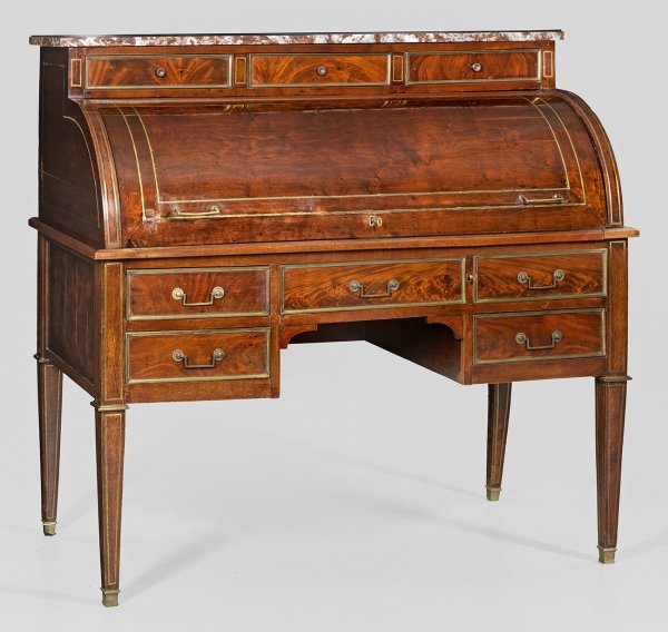 Mahagoni, furniert sowie Einlagen und Profile aus Messing. Gerader Korpus auf konischen Vierkantbeinen. In der gegliederten Front breites Kniefach sowie vier Schubladen unterschiedlicher Größe. Oberhalb bombierter Zylinderverschluss sowie ausziehbare Arbeitsfläche mit goldgeprägter, olivfarbener Ledereinlage. Dahinter gestaffelte Facheinteilung. Korrespondierender dreischübiger Abschluss mit gering überstehender Deckplatte aus sog. Rouge Royal Marmor. H. 120,5 cm. 128 cm x 65 cm.