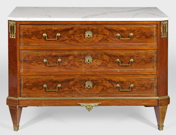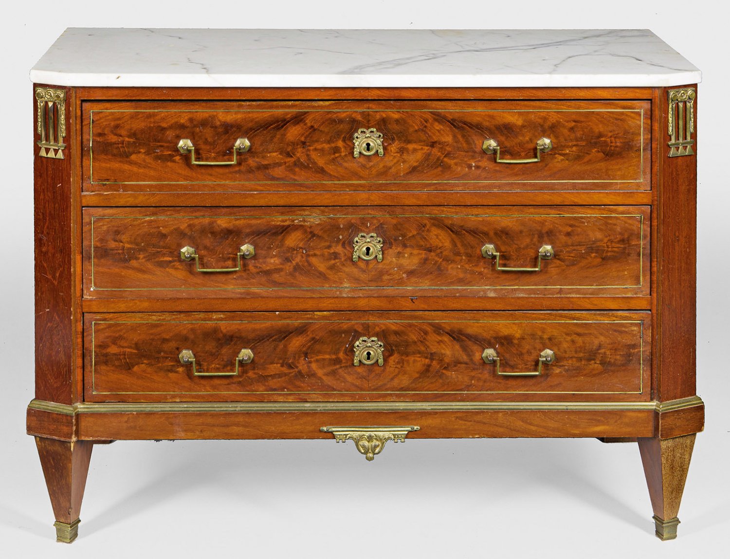 Mahagoni, furniert sowie Profile aus Messing. Gerader, querrechteckig angelegter Korpus, flankiert von schräggestellten Ecklisenen auf schmaler Zarge und konischen Vierkantbeinen. In der gegliederten Front drei breite Schubladen. Gering überstehende Deckplatte aus weißem Marmor. H. 77,5 cm. 106 cm x 45 cm.