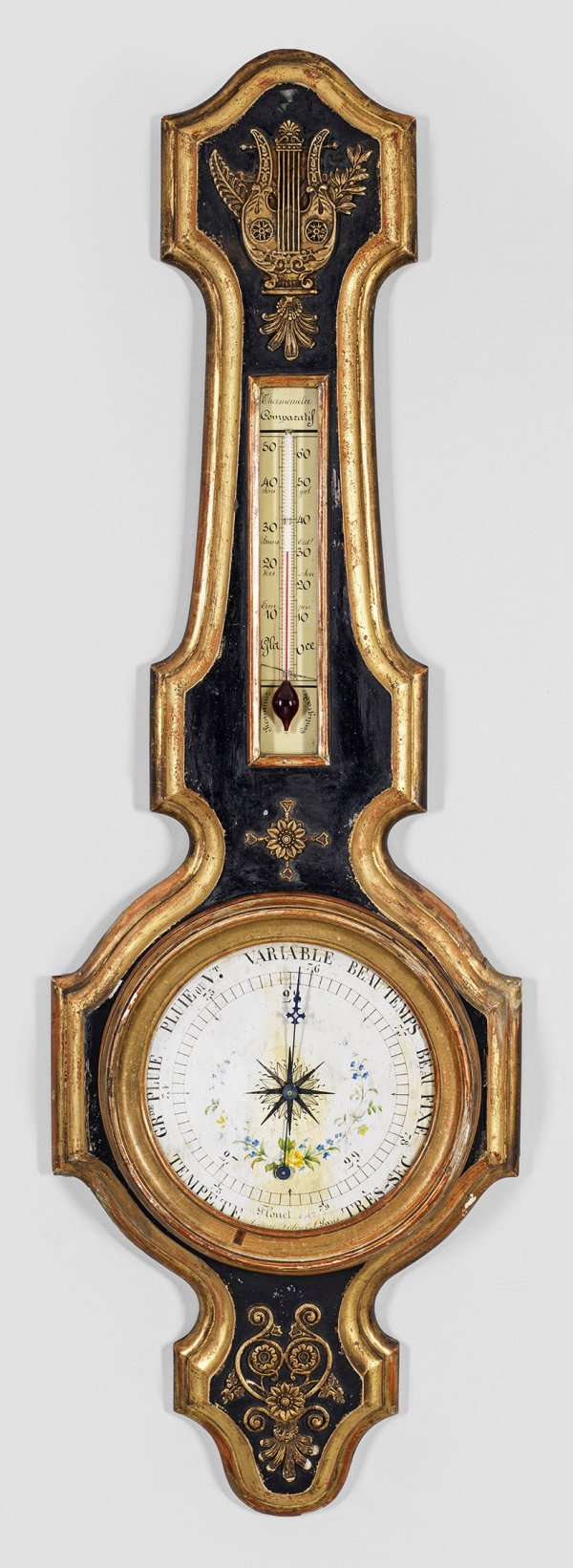 Holz, stuckiert, schwarz gefasst und teilw. vergoldet. Balusterförmiger, profiliert geschweifter Korpus mit schauseitig aufgelegtem Dekor aus Lyra-, Blatt- und Blütenmotiven. Runde, profilgerahmte Barometerscheibe mit polychromem Blütendekor, bez. "1, Boul. Diderot, 1, Paris". Oberhalb Thermometer. Unw. besch.; H. 99 cm.