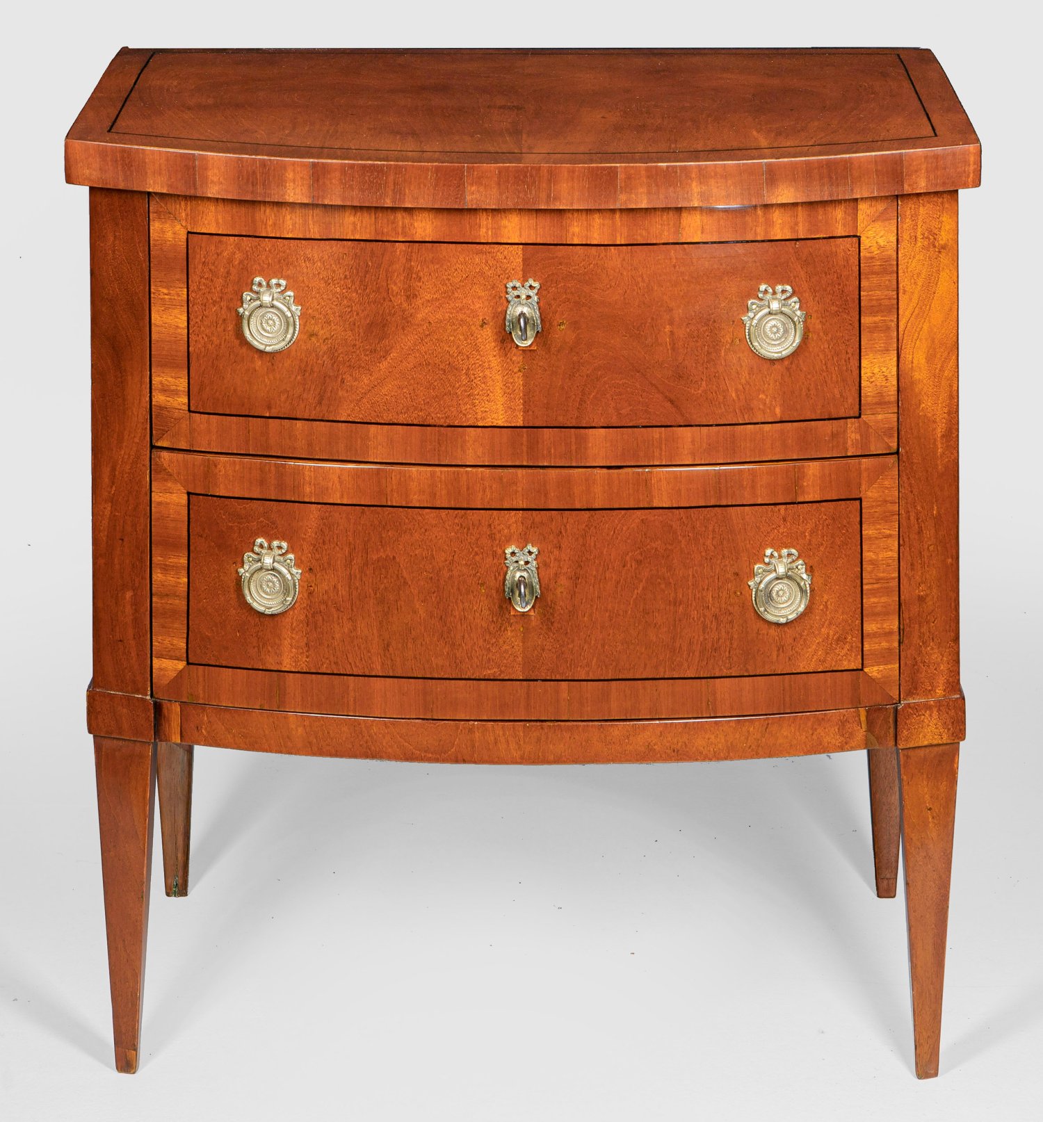 Helles Mahagoni, furniert. Gerader, rechteckiger Korpus auf schmaler Zarge und konischen Vierkantbeinen. In der gegliederten Front zwei bombierte Schubladen. Korrespondierende, gering überstehende Deckplatte. Rest.; H. 76 cm. 72 cm x 47 cm.