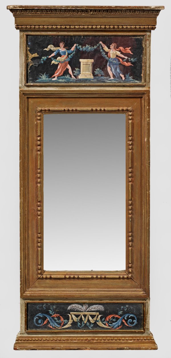 Holz, gefasst und vergoldet. Gerade, hochrechteckige, profilierte Spiegelrahmung mit Perlstabfries. Im breiten Giebelfeld verglaste polychrome Darstellung eines tanzenden Paares mit Feston. Korrespondierender unterer Abschluss mit eingerollten Volutenmotiven. 83,5 cm x 38 cm.