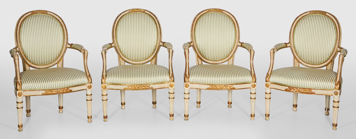 A set of four North German ivory coloured and partly gilt wood Louis XVI armchairs.