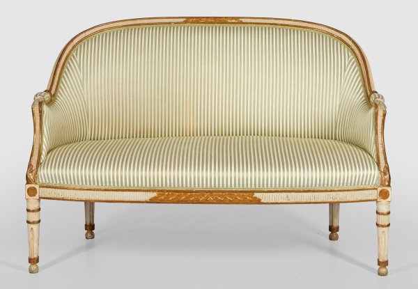 Holz, geschnitzt, elfenbeinfarben gefasst und teilw. vergoldet. Bombierte, fein kannelierte Zarge auf konischen Balusterbeinen. Geschweift ansteigende Stützen für schmale Armlehnen, in gewölbte Rückenlehnenrahmung übergehend. Allseitig gepolstert und bezogen. H. 91 cm. 138 cm x 70 cm. Sitz-H. 42 cm.