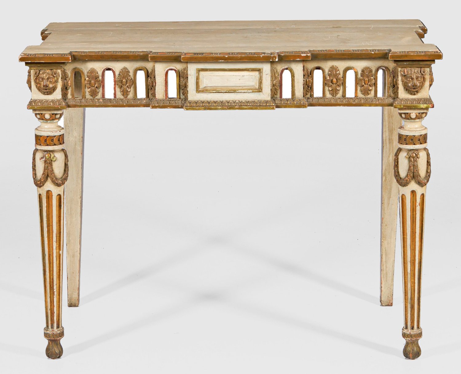 Holz, geschnitzt, elfenbeinfarben gefasst und teilw. vergoldet. Gerade, durchbrochen gearbeitete Zarge mit flachem Mittelrisalit auf mehrfach gegliederten, kannelierten und festonumspannten Balusterbeinen. Gering überstehende, profilierte und an den Ecken verkröpfte Deckplatte. H. 82 cm. 105 cm x 54 cm.