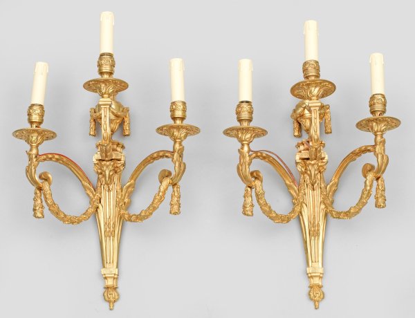 3-flg.; Bronze, vergoldet. Köcherförmiges, kanneliertes Wandschild mit großer Vasenbekrönung sowie reliefplastischem Widderkopf. Davon ausgehend stark geschwungene, teilw. durch Lorbeerfestons verbundene Leuchterarme mit vasenförmigen Tüllen. Nachträglich elektrifiziert. H. 54 cm.