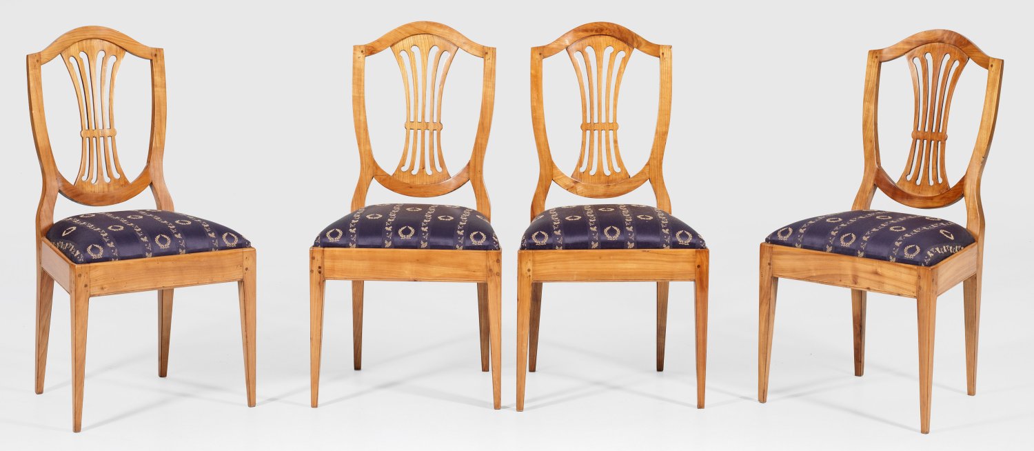 Kirschbaum, massiv. Trapezförmige Zarge auf spitz zulaufenden Vierkantbeinen. Schildförmige Rückenlehnenrahmung mit durchbrochen gearbeitetem, balusterförmigem Mittelsteg. Sitzfläche gepolstert und bezogen. Rest.; Sitz-H. 45 cm.