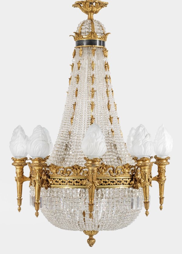 8-flg.; Bronze, teilw. schwarz lackiert und farbloses, teilw. satiniertes Glas. Balusterförmiger Korpus aus Prismenschnüren im Verlauf. Ornamentierter Reif aus Lorbeer mit durchbrochen gearbeiteten Palmettenbekrönungen als Träger für Leuchtmittel in Form von großen Fackeln. Kuppelförmiger oberer Abschluss. Innen elf Lampenfassungen. Elektrifiziert. H. 120 cm. D. 78 cm.
