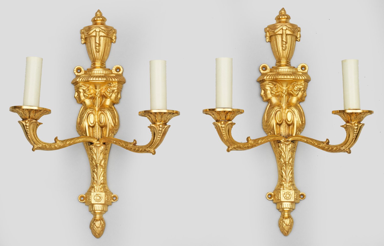 2-flg. Bronze, vergoldet. Balusterförmiges Wandschild aus gegeneinandergestellten Genienfiguren mit großer Vasenbekrönung. In der Mitte davon ausgehend flach geschweifte Leuchterarme mit zylinderförmigen Tüllen. Elektrifiziert. H. 41 cm.