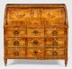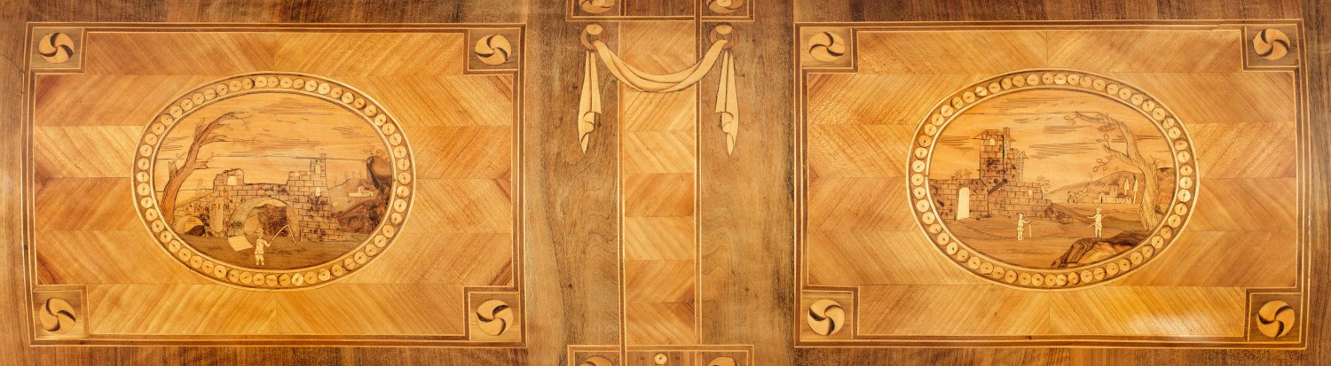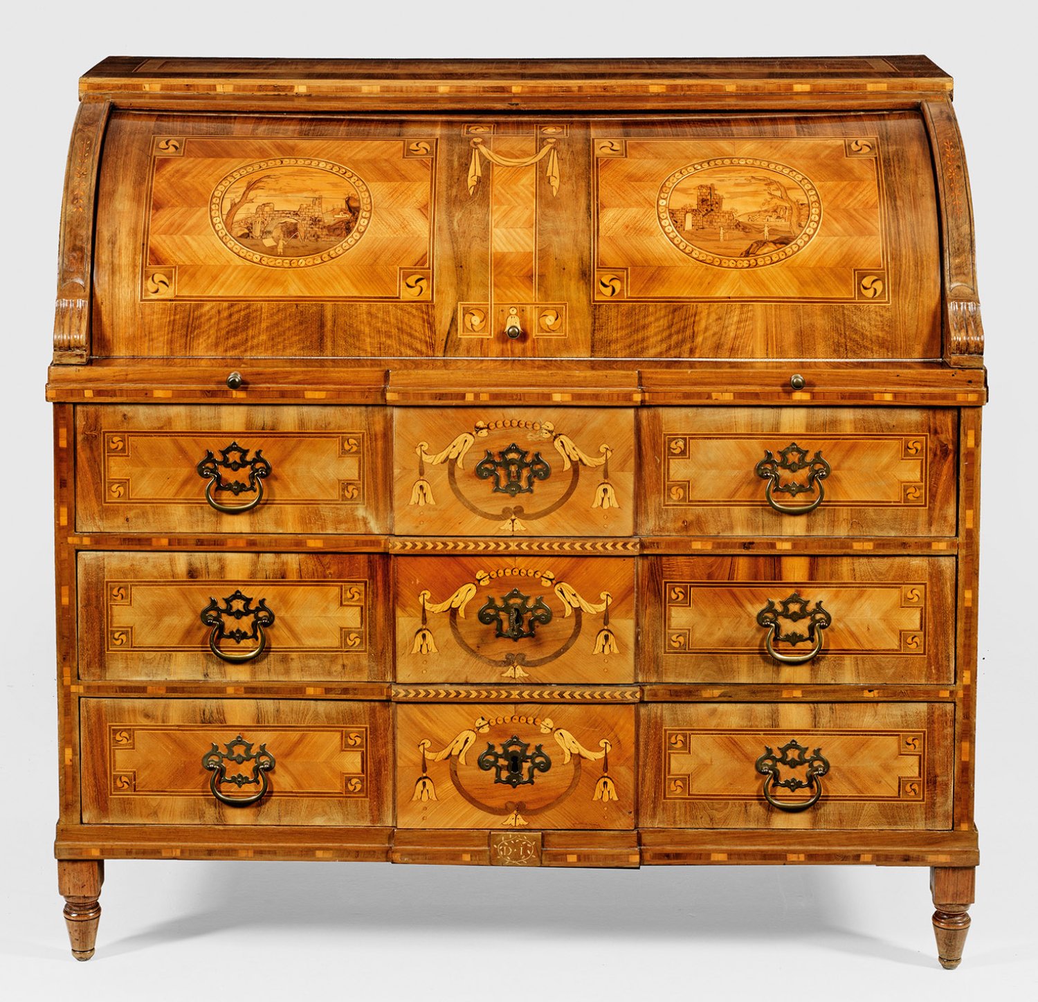 Nussbaum und Kirschbaum, furniert sowie brandschattierte Einlagen, u. a. aus Ahorn. Gerader, querrechteckig angelegter Korpus auf Balusterfüßen. In der gegliederten Front drei breite Schubladen mit flachem Mittelrisalit. Oberhalb ausziehbare Arbeitsfläche sowie bombierter Zylinderverschluss mit gerahmten Medaillons aus Ruinenlandschaften. Innen cremefarbene Filzauskleidung. Flächendeckend breit gerahmte, gespiegelt angeordnete Furnierfelder, von Bandeinlagen begrenzt sowie schauseitig Festons und Kelchblüten. H. 116 cm. 124 cm x 65 cm.