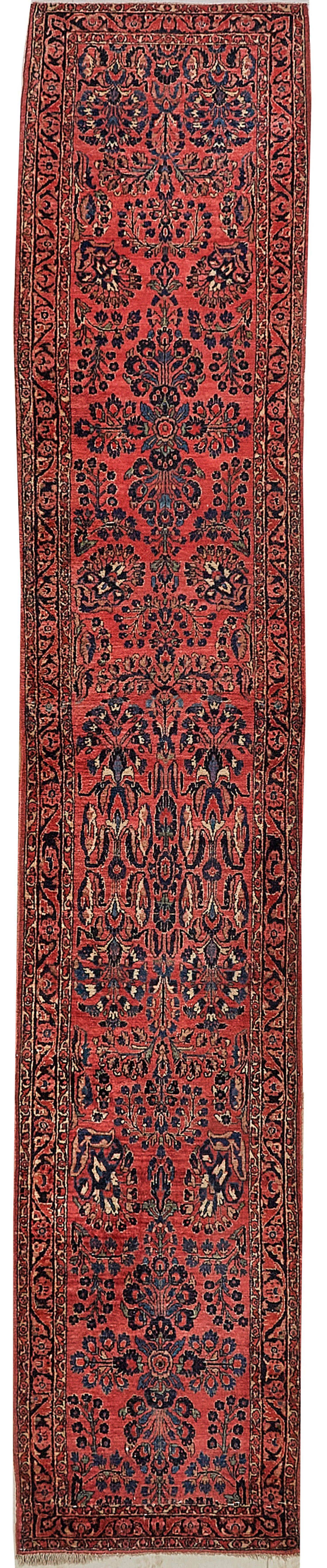 Persien. Um 1920. Wolle auf Baumwolle. Im roten Innenfeld flächendeckend dichte Musterung aus ornamental angeordneten Blütendolden und -zweigen. Umlaufend schmale Bordüre aus Blattwerk auf dunklem Grund. Gekürzt. 81 cm x 437 cm.