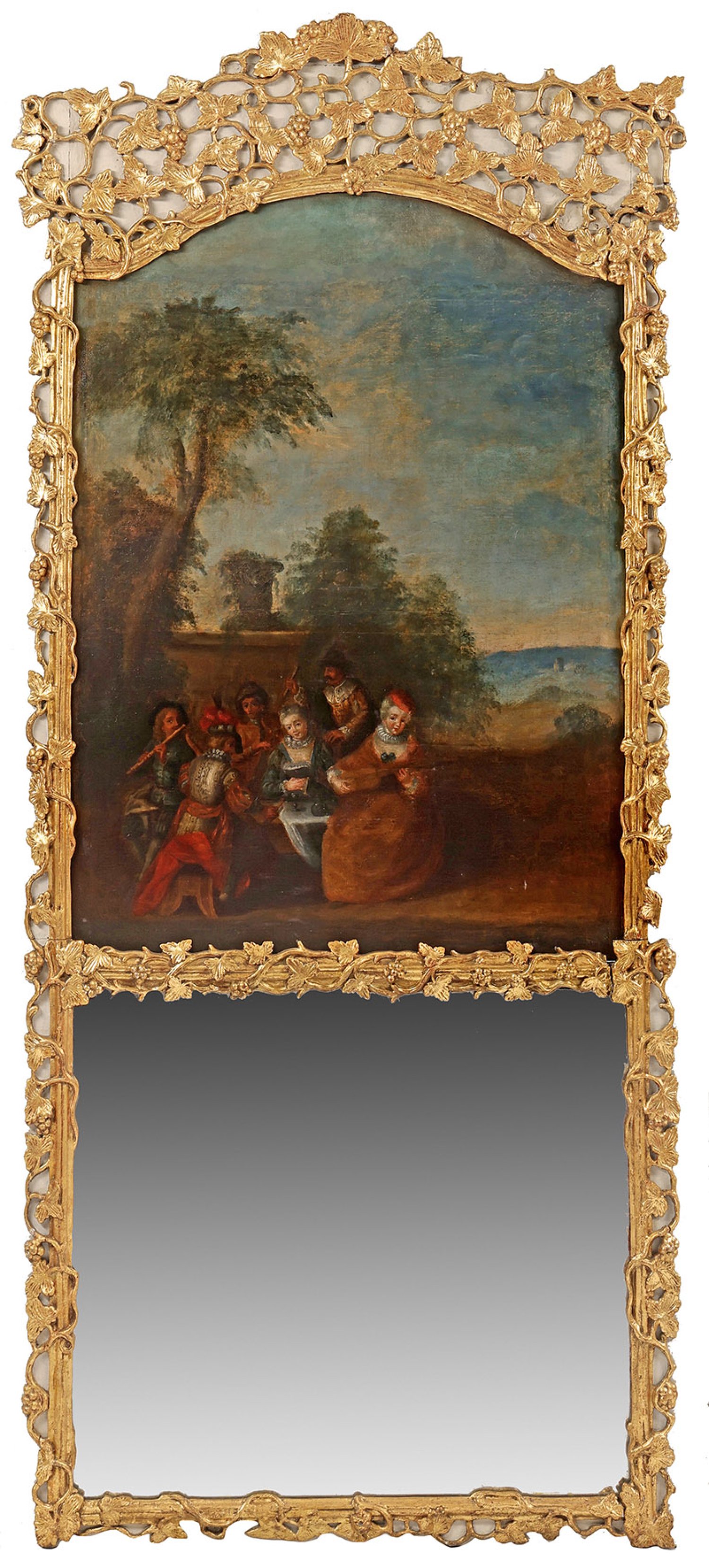 Holz, hellgrau gefasst sowie teilw. geschnitzt, gefasst und vergoldet sowie Öl auf Leinwand. Gerades, hochrechteckiges Paneel mit aufgelegter, profilierter Rahmung aus üppigen, durchbrochen gearbeiteten Weinreben für große, eingesetzte Genredarstellung in Ideallandschaft mit gewölbtem oberen Abschluss. Unterhalb rechteckiges Spiegelglas. 232 cm x 108 cm.