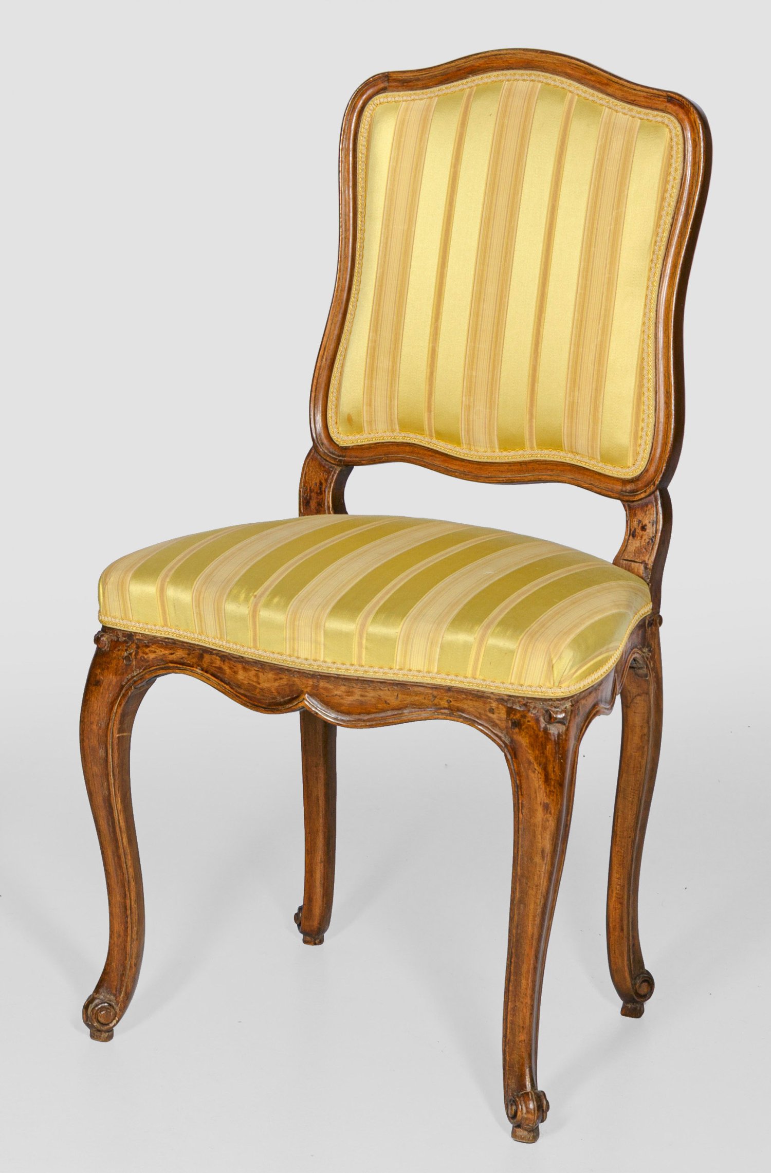 Nussbaum. Passig geschweifte Zarge auf schlanken Volutenbeinen sowie schildförmige, umlaufend profilierte Rückenlehnenrahmung. Allseitig gepolstert und bezogen. Rest. mit Erg.; Sitz-H. 46 cm.