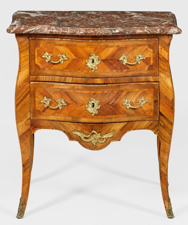 Rosenholz, furniert. Bombierter Korpus, flankiert von schmalen Ecklisenen, in hohe, geschweifte und sich konisch verjüngende Beine übergehend. In der gegliederten Front zwei Schubladen avec traverse. Flächendeckend breit gerahmte, gespiegelt angeordnete Furnierfelder, von Bandeinlagen begrenzt. Korrespondierende, gering überstehende und profilierte Deckplatte aus rotbraunem, weiß-grau gemasertem Marmor. H. 82 cm. 72 cm x 45,5 cm.
