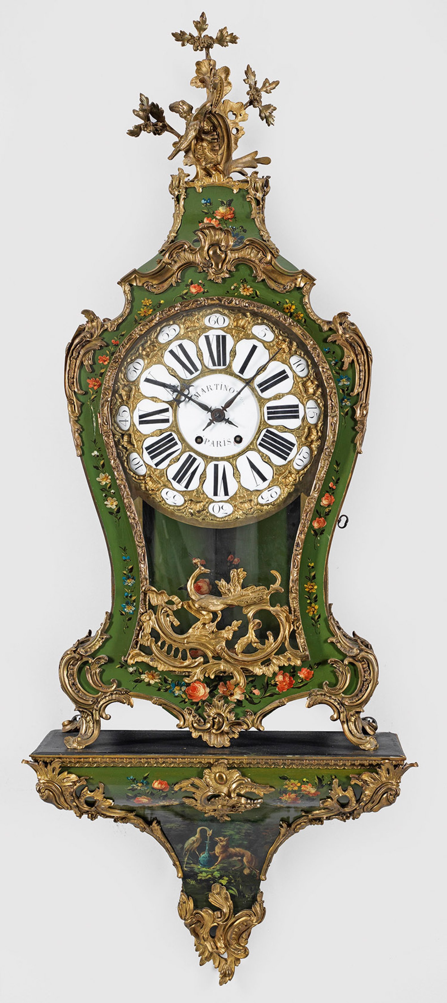 Holz, grün gefasst sowie polychromer Blütendekor und Bronzedekorationen. Balusterförmiger, dreiseitig verglaster Korpus, umgeben von Rocaillemotiven mit geschweift ansteigendem oberen Abschluss und Rocaillebekrönung mit Reiher. Reliefiertes Zifferblatt aus Emailreserven, bez. "Matinot à Paris". Pendulenwerk mit Pendelfeder sowie Halbstundenschlag auf Glocke. Korrespondierende Konsole, schauseitig mit Fabeldarstellung von Fuchs und Storch. Ges.-H. 144 cm.