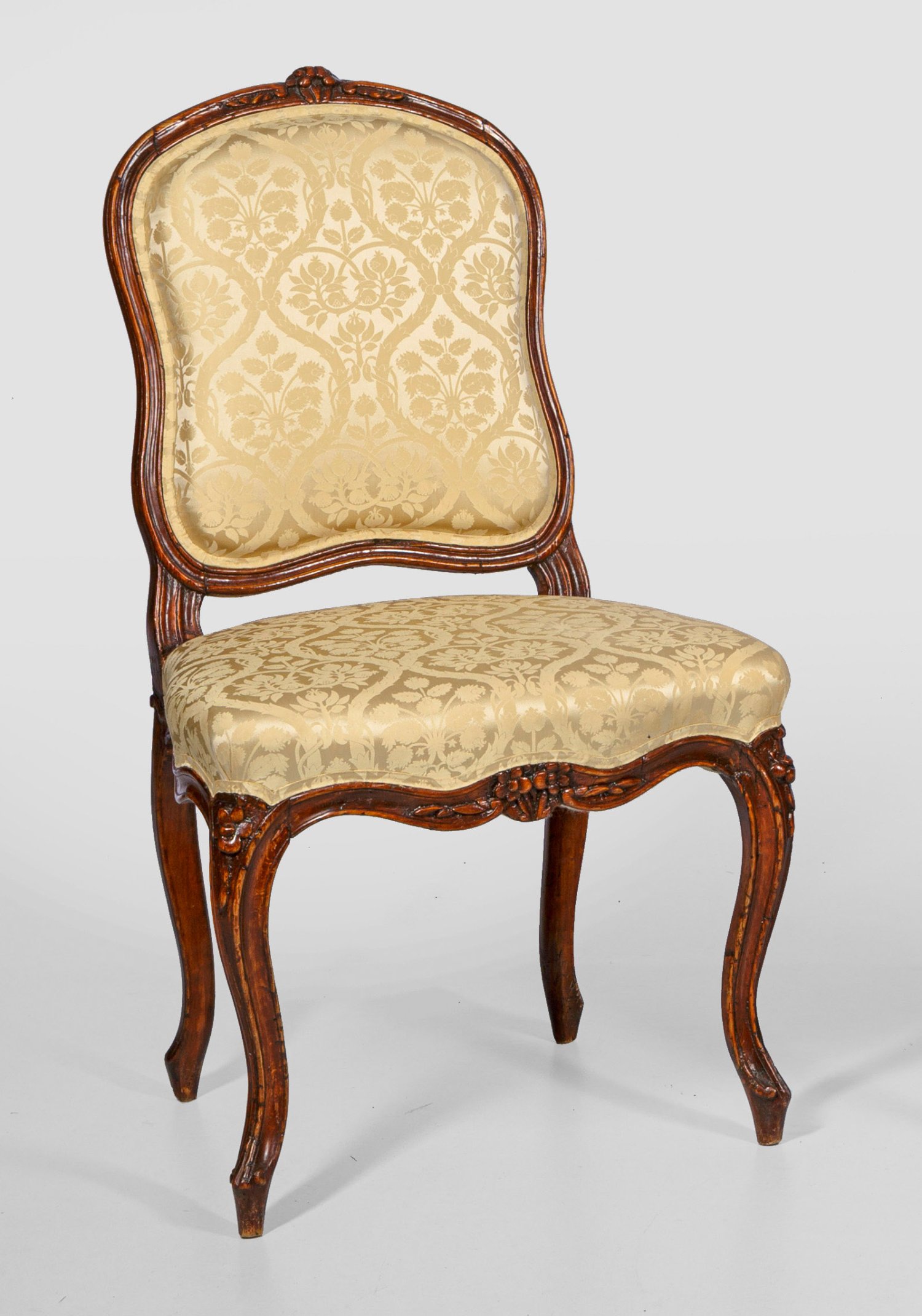 Buchenholz, teilw. reliefplastisch geschnitzt und nussbaumfarben gebeizt. Bombierte Zarge mit reliefplastischen Blüten, in geschweifte Beine übergehend. Schildförmige Rückenlehnenrahmung. Allseitig gepolstert und bezogen. Sitz-H. 46 cm.