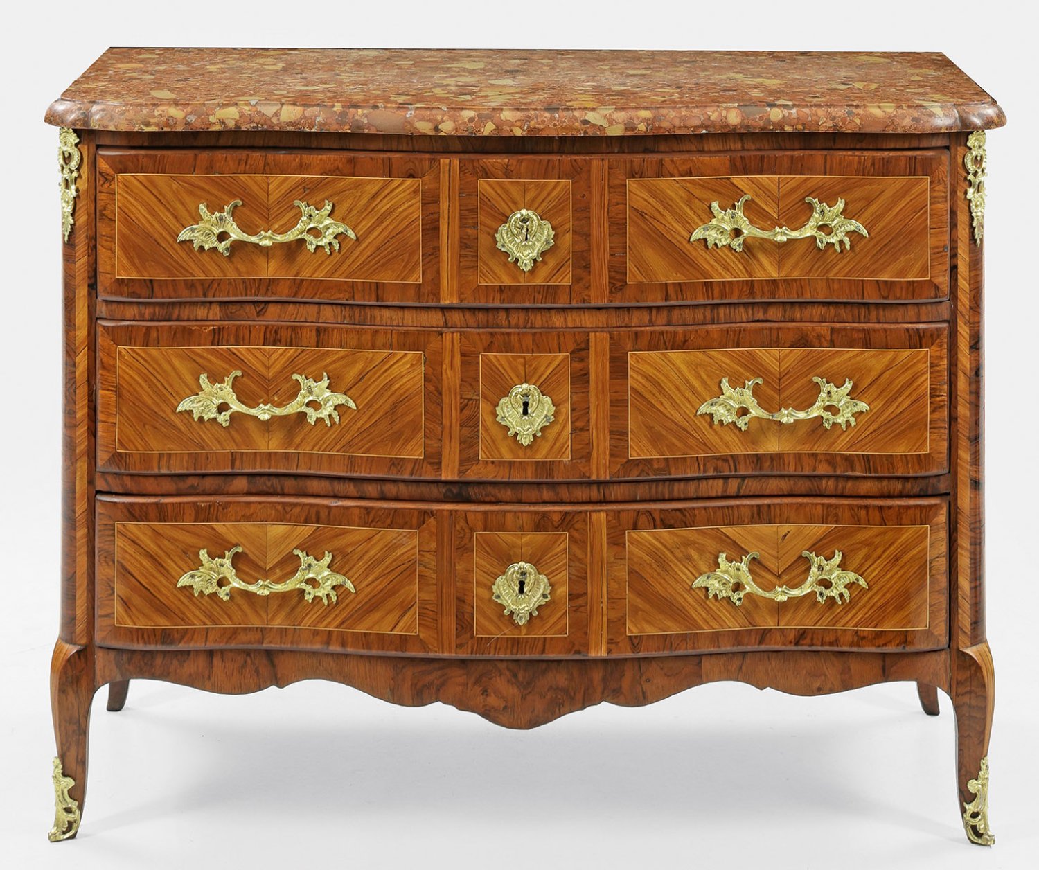 Palisander und Rosenholz, furniert. Gerader, querrechteckig angelegter Korpus mit passig geschweifter Zarge, flankiert von gerundeten Ecklisenen, in geschwungene Füße übergehend. In der gegliederten Front drei breite, mehrfach geschweifte Schubladen. Flächendeckend breit gerahmte, gespiegelt angeordnete Furnierfelder, von Fadeneinlagen begrenzt. Korrespondierende Deckplatte aus rotbraun und beigefarben gemasertem Marmor. H. 86,5 cm. 115 cm x 52 cm.
