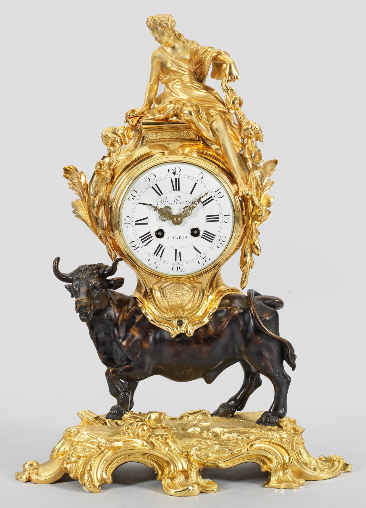 Bronze, vergoldet und teilw. dunkel patiniert. Über naturalistisch gestaltetem Sockel mit üppigen Rocaillen vollplastische Darstellung eines Stiers als Träger für rundes, von Voluten umgebenes Uhrengehäuse. Skulpturale Bekrönung in Gestalt der Europa mit üppigen Blütengirlanden. Profilgerahmtes, verglastes, unw. besch. Emailzifferblatt, bez. "Pre Leurtier à Paris". Pendulenwerk mit Pendelfeder sowie Halbstundenschlag auf Glocke. Entw. eines ähnlichen Modells: Robert Osmond, um 1750. H. 51 cm.