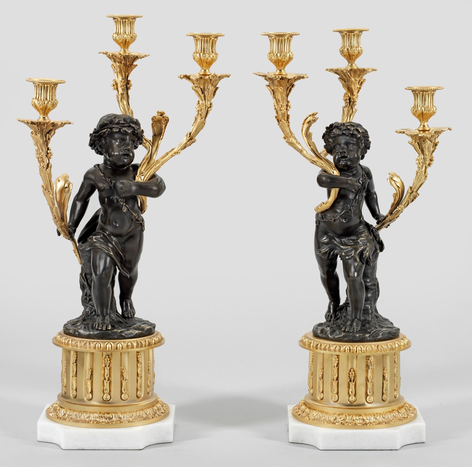 Gegenstücke. 3-flg.; Bronze, dunkel patiniert bzw. vergoldet und weißer Marmor. Über flacher Plinthe kannelierter Säulenschaft mit Palmettenfries. Oberhalb davon ausgehend vollplastische Darstellung von Puttenkindern als Träger für stark geschwungene Leuchterame aus Blattwerk mit vasenförmigen Tüllen. H. 61 cm.