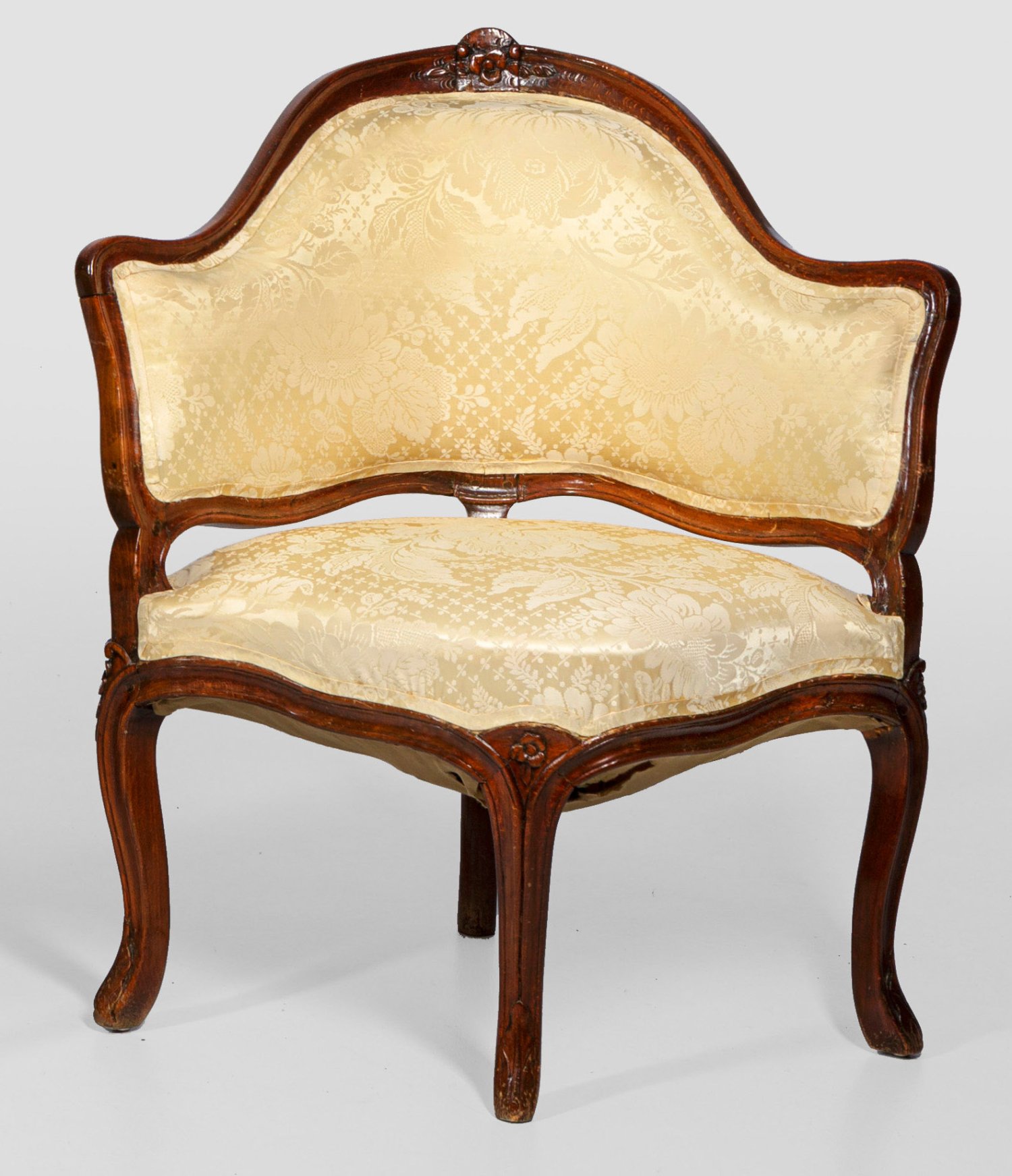 Buchenholz, nussbaumfarben gebeizt. Passig geschweifte Zarge auf leicht geschweiften Beinen. Kurze Stützen für über Eck gestellte, hoch aufgeworfene Lehnenrahmung. Allseitig gepolstert und bezogen. H. 77,5 cm. 72 cm x 52 cm. Sitz-H. 40 cm.