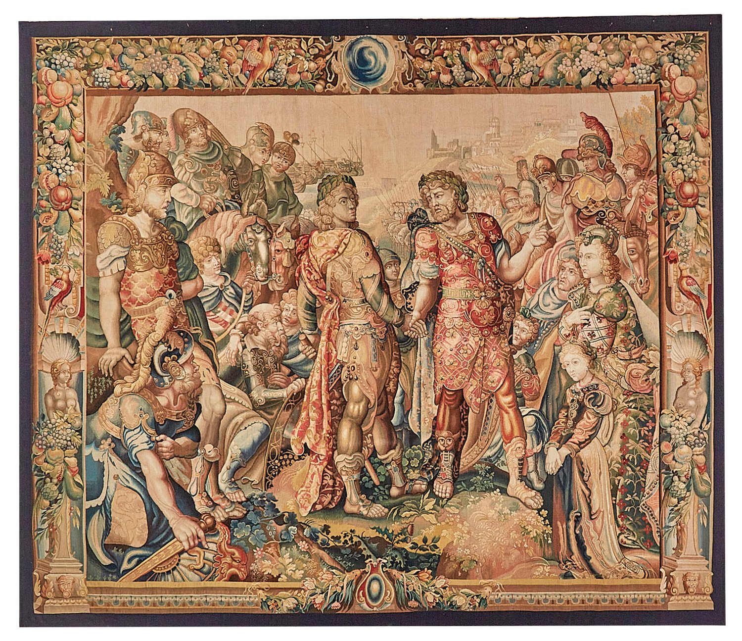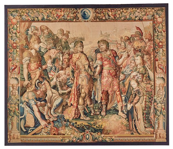 Wolle in unterschiedlichen Braun-, Beige- und Blautönen, flach gewebt. Im Bildfeld vielfigurig angelegte Historiendarstellung im Stil des 17. Jhs.; mit zwei gegenüber gestellten Heeren sowie ihren beiden Heerführern beim Schließen einer Alianz. Im Hintergrund aufgestellte Reitertruppen vor einer Stadtkulisse sowie Schiffsflotte. Breite Rahmung aus üppigem Fruchtwerk, Papageien sowie weiblichen Hermenfiguren. 224 cm x 266 cm.