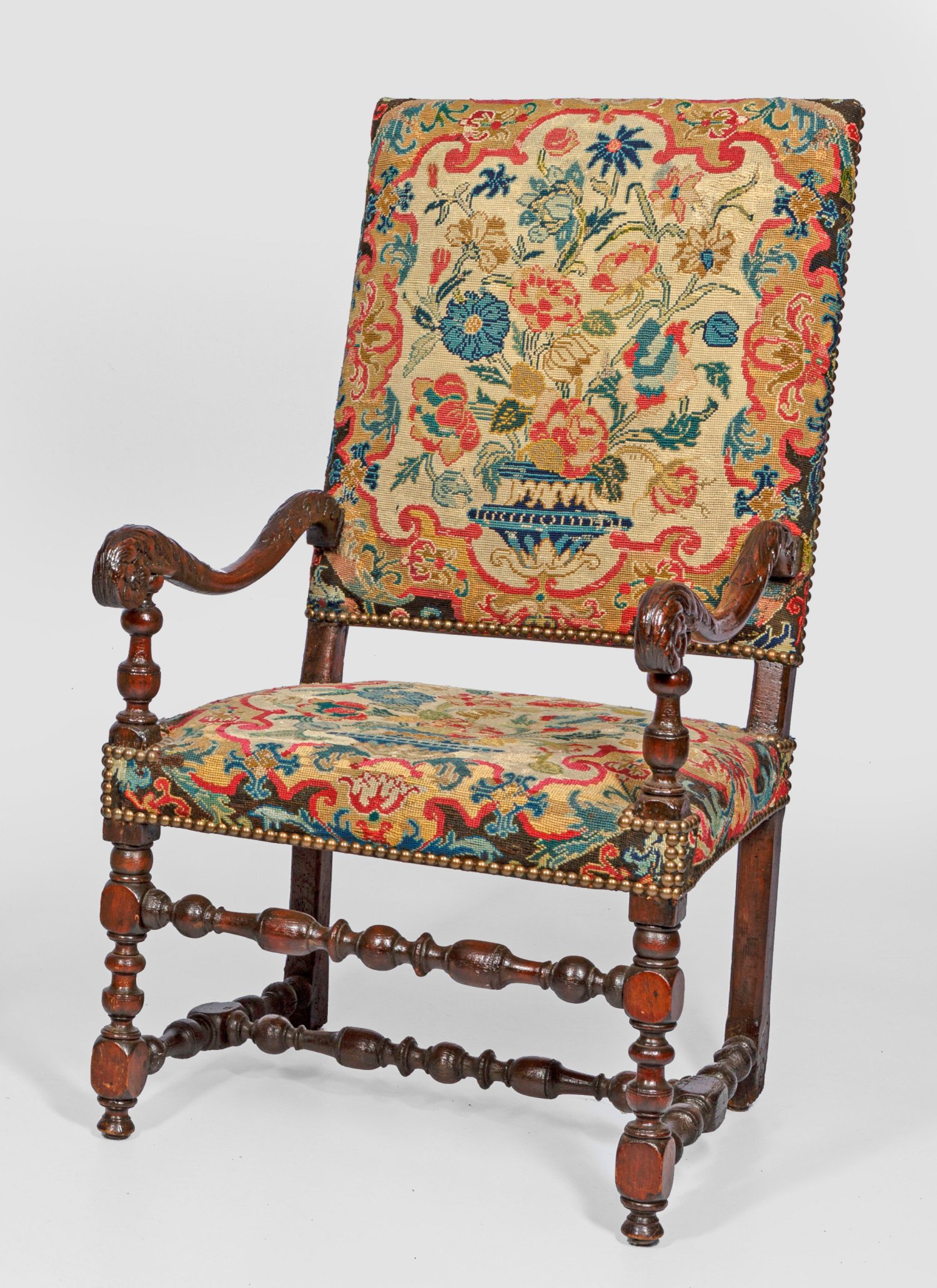 Eichenholz. Rechteckige Zarge auf mehrfach gegliederten Balusterbeinen, unterhalb durch entsprechende Stege verbunden. Kurze Stützen für schmale, geschweifte Armlehnen. Hochrechteckige Rückenlehnenrahmung. Gepolstert und schauseitig mit figural gestaltetem Gobelin bezogen. H. 110 cm. 63 cm x 70 cm. Sitz-H. 43 cm.
