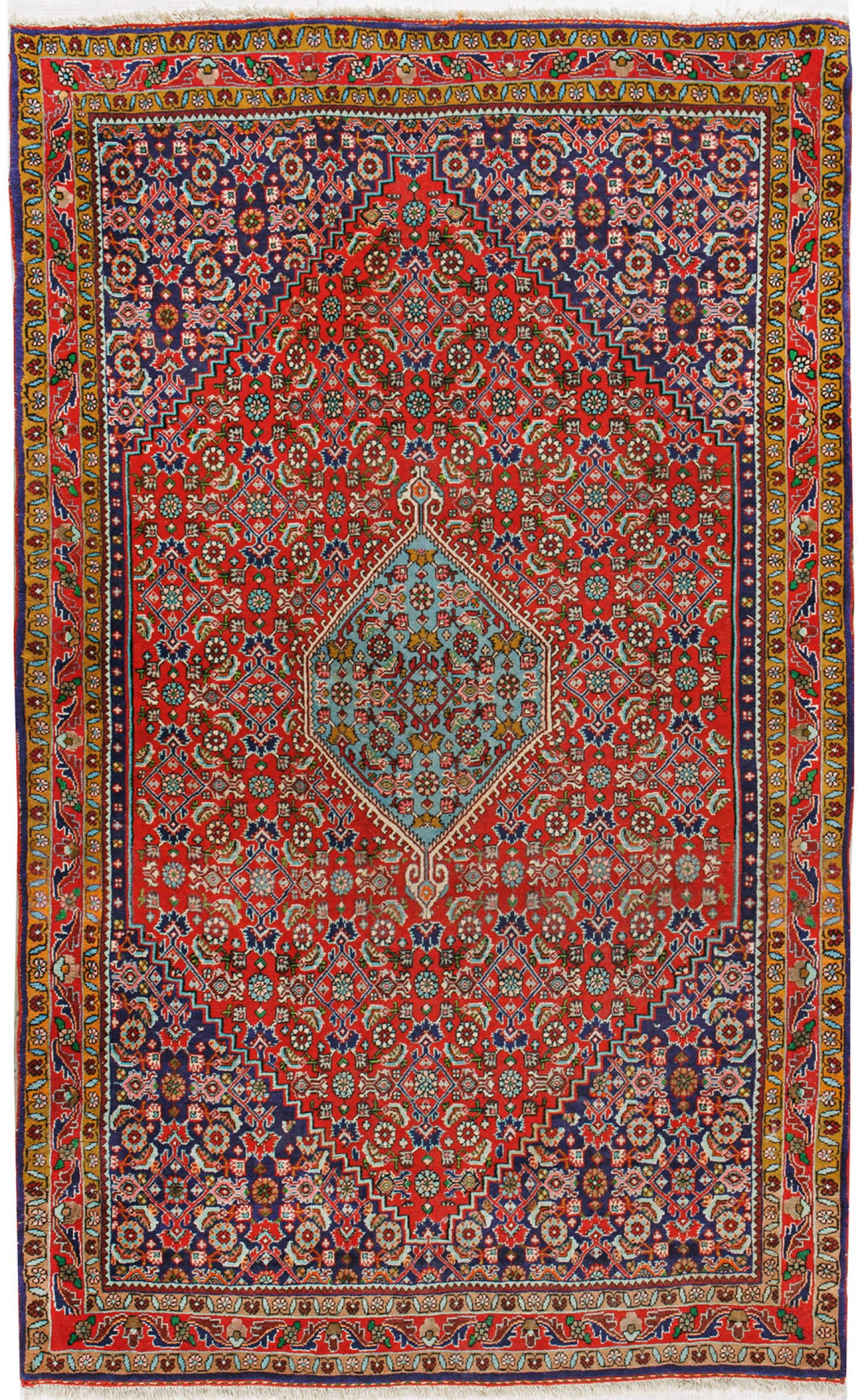 Persien. Wolle auf Baumwolle. Im roten Innenfeld hellblaues Rautenmotiv sowie dunkelblaue Ecklösungen. Flächendeckende Herati-Musterung sowie umlaufend mehrteilige Bordüre. 132 cm x 206 cm.