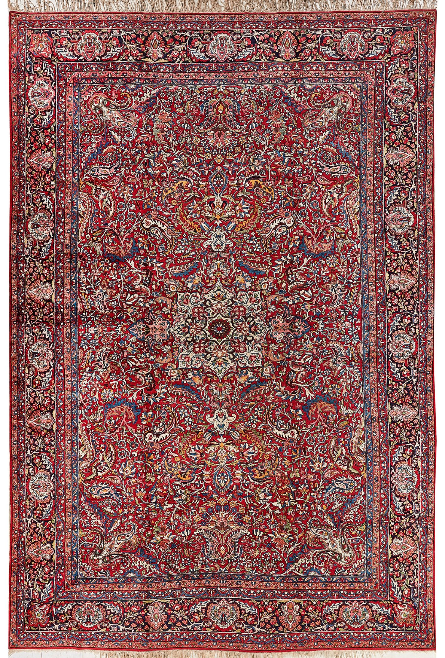 Persien. Wolle auf Baumwolle. Im roten Innenfeld kartuschenförmiges Zentralmedaillon sowie flächendeckend dichte, arabesk angeordnete Musterung aus üppigen Blüten und Lanzettblättern. Umlaufend breite Hauptbordüre aus großen Palmetten, flankiert von schmalen Bändern. 325 cm x 466 cm.