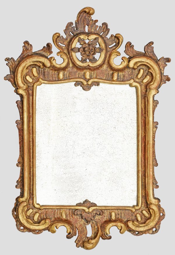 Holz, geschnitzt, gefasst und vergoldet. Hochrechteckige, profilierte Spiegelrahmung mit verkröpften Ecken aus Muschelwerk. Durchbrochen gearbeitete Rocaillebekrönung mit zentraler Blütenkartusche sowie korrespondierender unterer Abschluss. 40 cm x 27 cm.