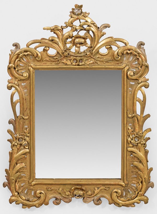Holz, geschnitzt, gefasst und vergoldet. Hochrechteckige Spiegelrahmung, umgeben von durchbrochen gearbeitetem, stilisiertem Schilfblatt, Blüten und Muschelmotiven, in korrespondierende, asymmetrisch gestaltete Bekrönung mit Rosenblüten übergehend. 105 cm x 73 cm.