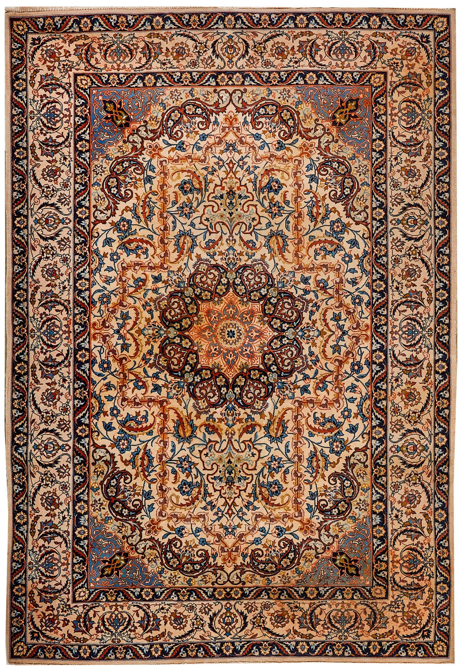 Persien. Wolle auf Seide. Im cremefarbenen Innenfeld zentrales, großes Rundmedaillon sowie breite Ecklösungen aus Blattvoluten. Flächendeckende Musterung aus Rankenwerk. Umlaufend breite, korrespondierende Bordüre aus Palmetten und Lanzettblättern. 161 cm x 110 cm.