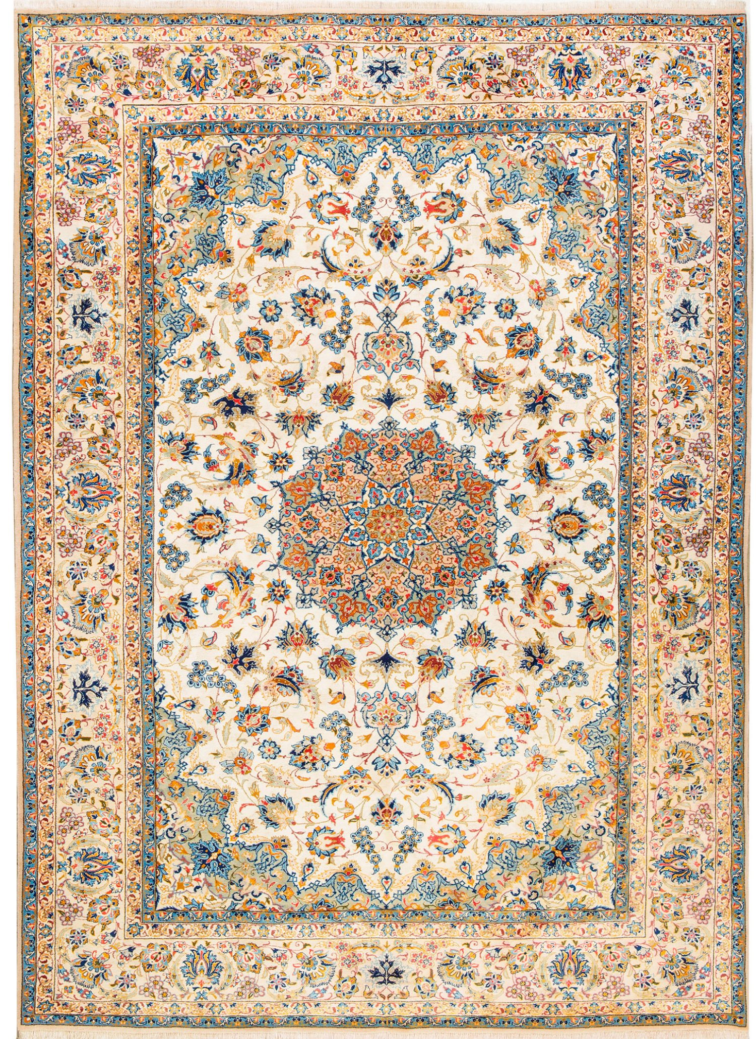Persien. Wolle auf Seide. Feine Knüpfung. Im elfenbeinfarbenen Innenfeld zentrales Rundmedaillon sowie passig geschweifte Ecklösungen. Flächendeckende Musterung aus Rankenwerk. Umlaufend breite, elfenbeinfarbene Bordüre aus Palmetten und Blütenrosetten, flankiert von schmalen Bändern. Partiell Colour run. 155 cm x 220 cm.