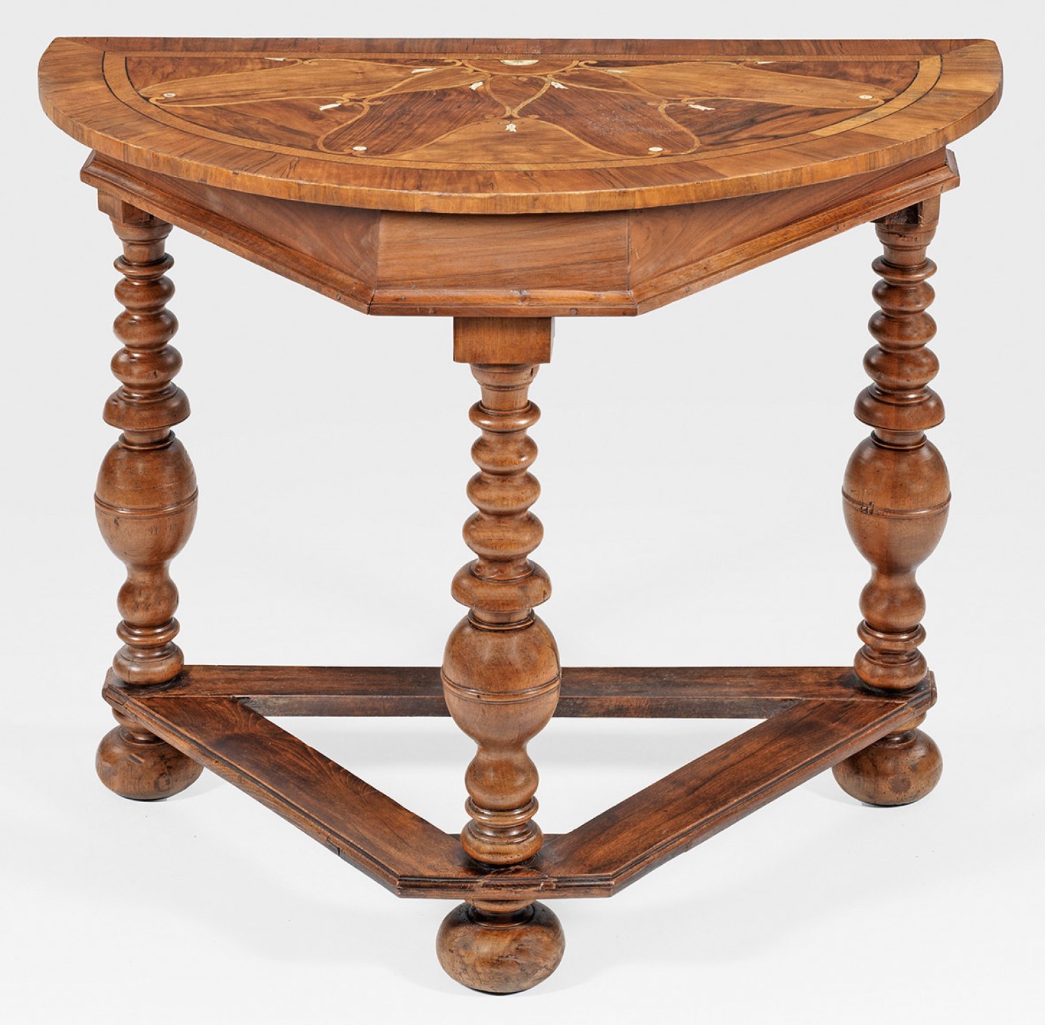 Nussbaum, massiv und furniert. Gestell aus mehrfach gegliederten Balusterbeinen, unterhalb durch breite Stege verbunden. Oberhalb gerade, sich konisch verbreiternde Zarge als Träger für Demi Lune-förmige Deckplatte mit Bandelwerk. H. 86 cm. 99 cm x 56 cm.