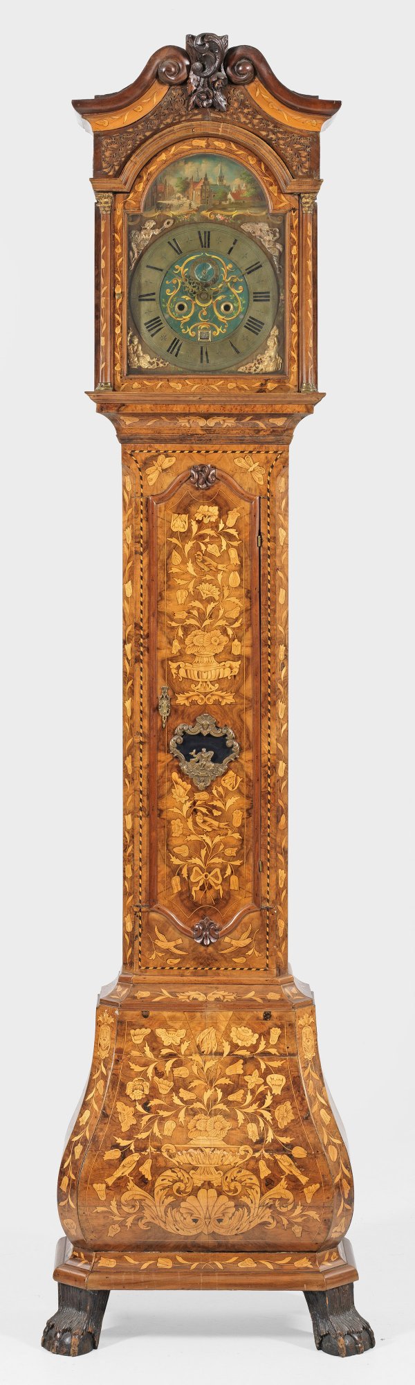 Nussbaum, furniert sowie reiche Marketerie aus unterschiedlichen Edelhölzern. Eintüriger Korpus, flankiert von schräggestellten Ecklisenen auf bombiertem Podestsockel. Vorkragender Uhrenkopf, flankiert von eingestellten Halbsäulen mit profiliertem Gesims aus gegeneinandergestellten Voluten. Polychrom gestaltetes Zifferblatt mit szenischer Stadtansicht, Datumsanzeige und kleiner Sekunde, bez. Meindert Waerma, Groningen. Werk mit Ankerhemmung sowie Halbstundenschlag auf Tonfeder. H. 228 cm.