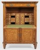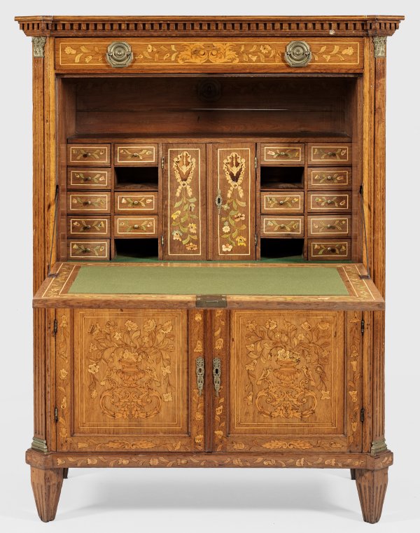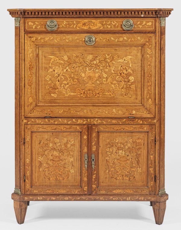 Eichenholz mit reicher Marketerie aus unterschiedlichen Edelhölzern. Gerader, hochrechteckiger Korpus, flankiert von schräggestellten Ecklisenen mit kannelierten Pilastern auf konischen Füßen. In der gegliederten Front zwei profilierte Türen sowie abklappbare Arbeitsplatte. Dahinter Facheinteilung. Oberhalb schmales Schubfach sowie profilierte Deckplatte mit Zahnfries. Flächendeckender Dekor aus Blüten, Volutenmotiven und Vögeln. Erg., H. 154 cm. 118 cm x 56 cm.