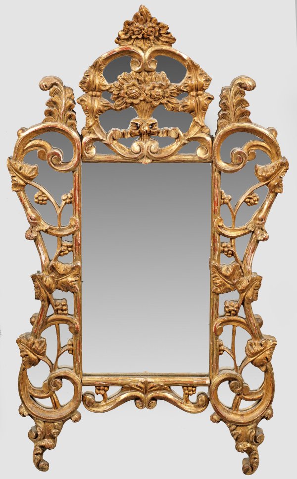 Holz, geschnitzt, gefasst und vergoldet. Passig geschweifte, durchbrochen gearbeitete Spiegelrahmung aus eingerollten Voluten und Weinreben mit reliefierten Lanzettblättern. Korrespondierende Bekrönung mit zentralem Blütenmotiv. 93 cm x 55 cm.