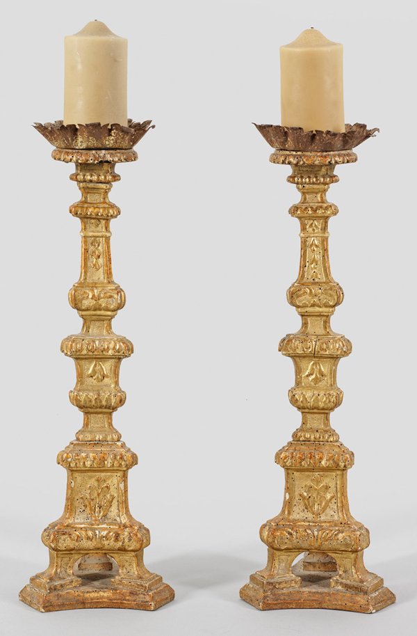 A pair of large carved and partly gilt wood Baroque candlesticks.