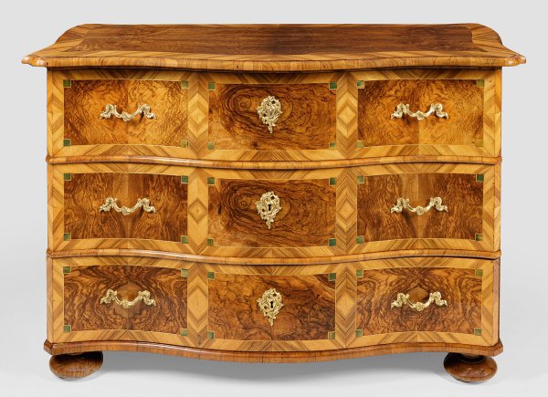 Nussbaum und Nussbaummaser, furniert, sowie teilw. grün gefärbte Einlagen. Gerader, querrechteckig angelegter Korpus auf flacher Zarge und stark gedrückten Füßen. In der gegliederten Front drei breite, geschweifte Schubladen. Profilierte, passig geschweifte Deckplatte. Flächendeckend breit gerahmte Furnierfelder. H. 86 cm. 131 cm x 67 cm.