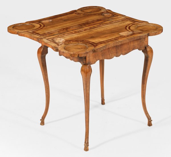 Nussbaum, massiv und furniert sowie Bandeinlagen aus Pflaumenholz. Gerader, passig geschweifter Zargenkasten auf hohen, geschwungenen und spitz zulaufenden Beinen. Weit überstehende, aufklappbare Deckplatte mit stark gerundeten Ecken sowie Vertiefungen für Spielsteine. H. 76 cm. 84 cm x 42/84 cm.