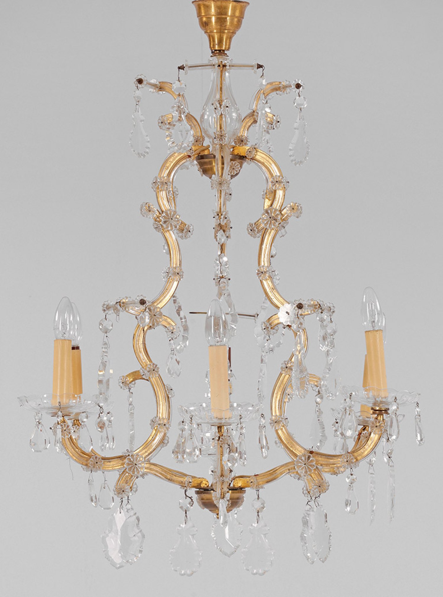 6-flg.; Farbloses Glas und goldfarbenes Metall. Offen gestalteter, balusterförmiger Korpus aus stark geschwungenen Streben als Träger für zylinderförmige Tüllen über großen Traufschalen. Oberhalb kurzer Balusterabschluss sowie reicher Behang aus facettierten Prismen. Elektrifiziert. Unvollständig. H. 90 cm. D. 70 cm.