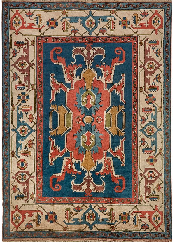 Türkei. Wolle auf Wolle. Im blauen Innenfeld flächendeckendes Kartuschenmotiv mit großen Blattvoluten. Umlaufend schmale rote Rahmung sowie breite Bordüre aus großen Palmettenranken. 352 cm x 253 cm.