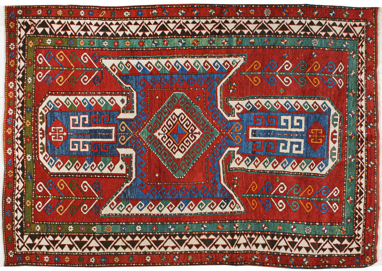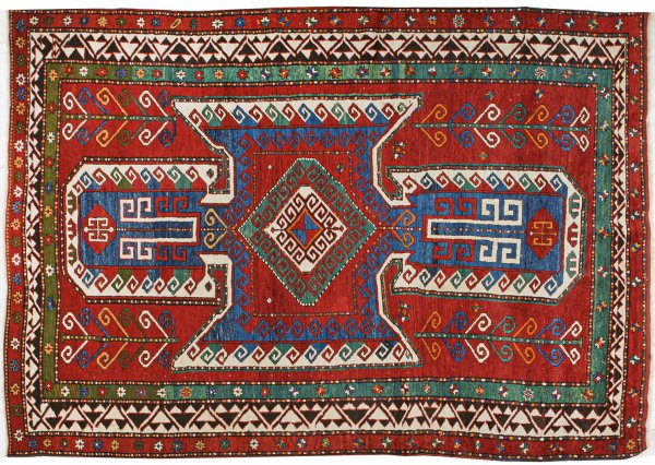 Kaukasus. Wolle auf Wolle. Im roten Innenfeld großes, hakenbesetztes Schildmotiv in Blau- und Beigetönen. Umlaufend mehrteilige Bordüre aus unterschiedlich breiten Ornamentbändern. Rep.; 262 cm x 182 cm.